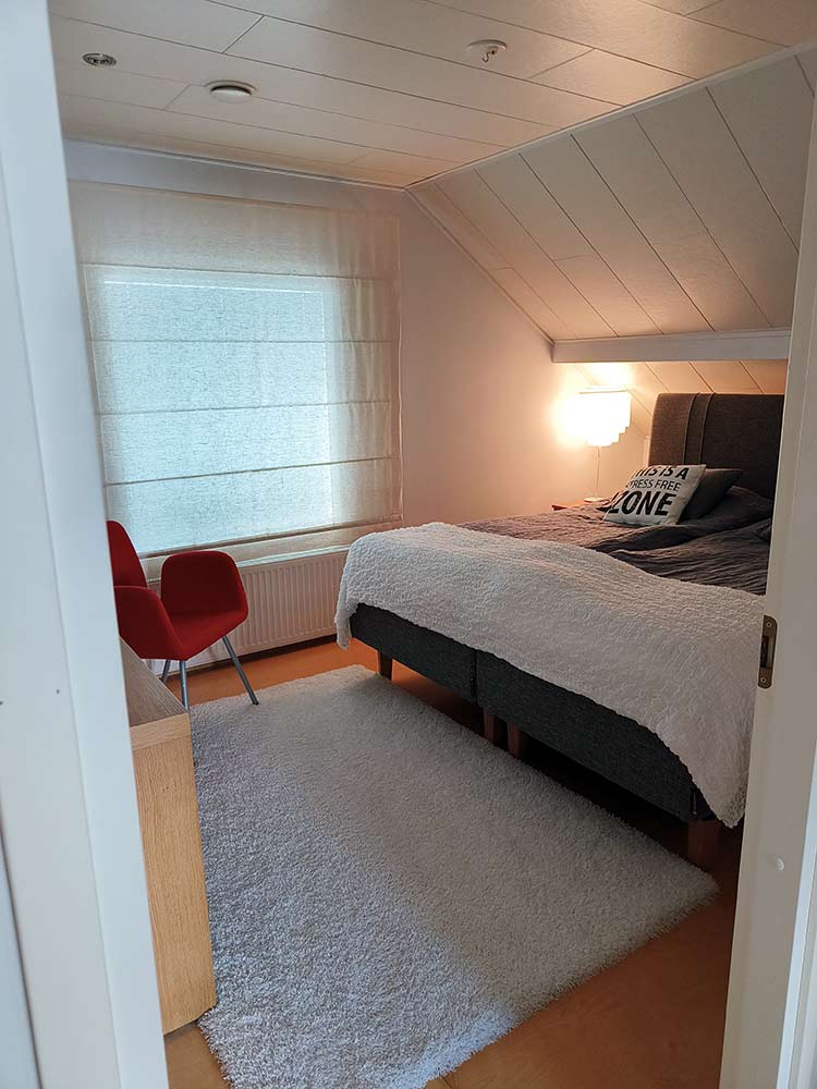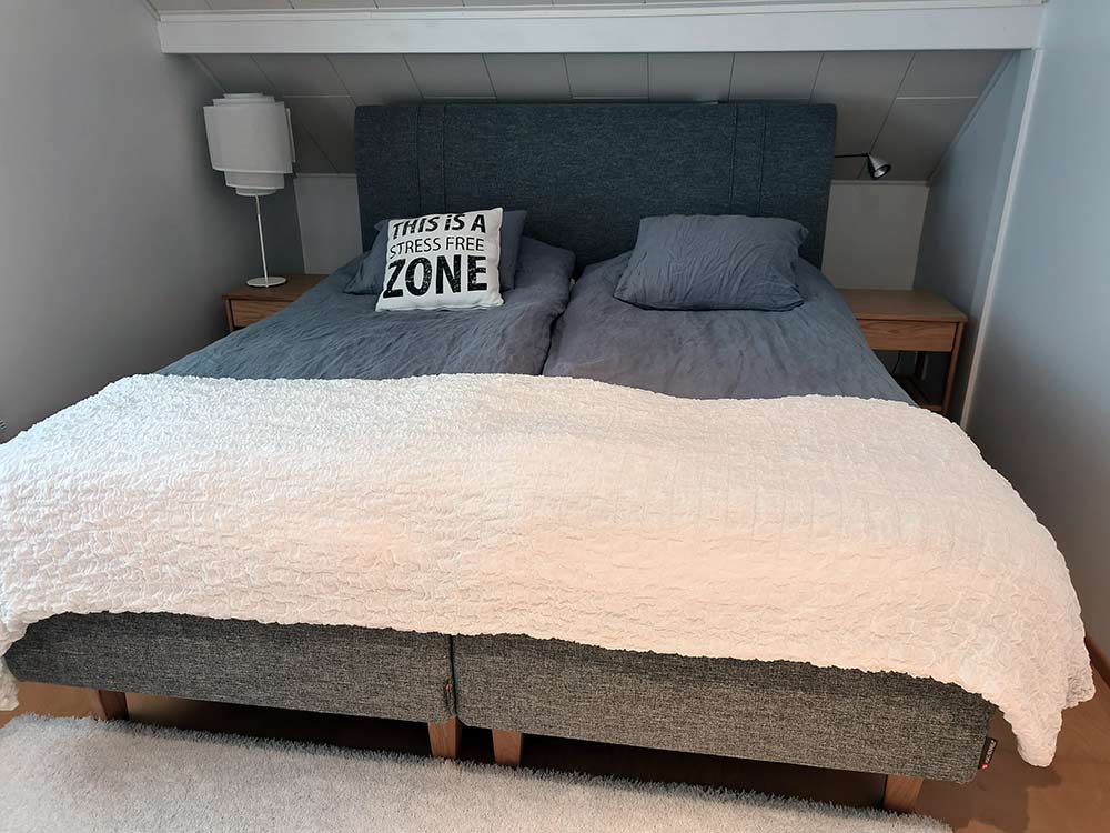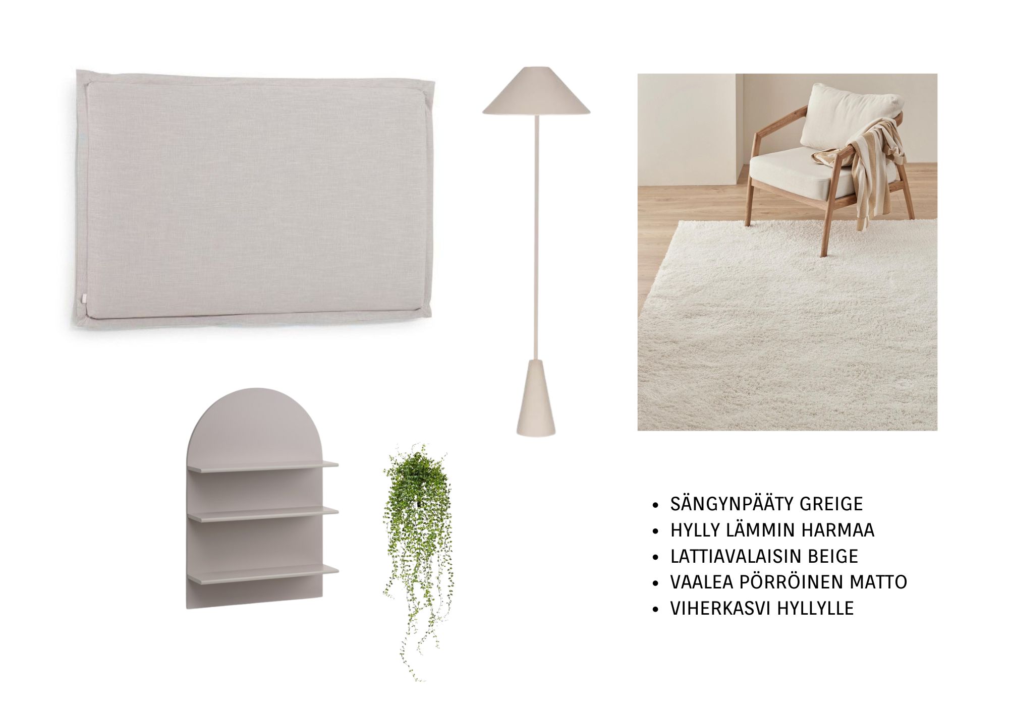 Vaihtaisin makuuhuoneeseen kokolattiamaton, sillä kyseessä on aikuisten makuuhuone ja haastavan painava sängynpääty. Mitä vähemmän on huomiopisteitä, sitä enemmän minimalistinen sisustustyyli kiittää. Kokolattiamatto voi olla myös hieman pidempinukkainen materiaali. Esimerkiksi paljon käytetty Vm Carpetin Hattara vaaleassa sävyssä sopisi hyvin, mutta myös harmaat kokolattiamaton värit sopisivat hallitsevan sängynpäädyn kanssa. Tällä hetkellä sängynpääty on melko yksinäinen värinsä puolesta.