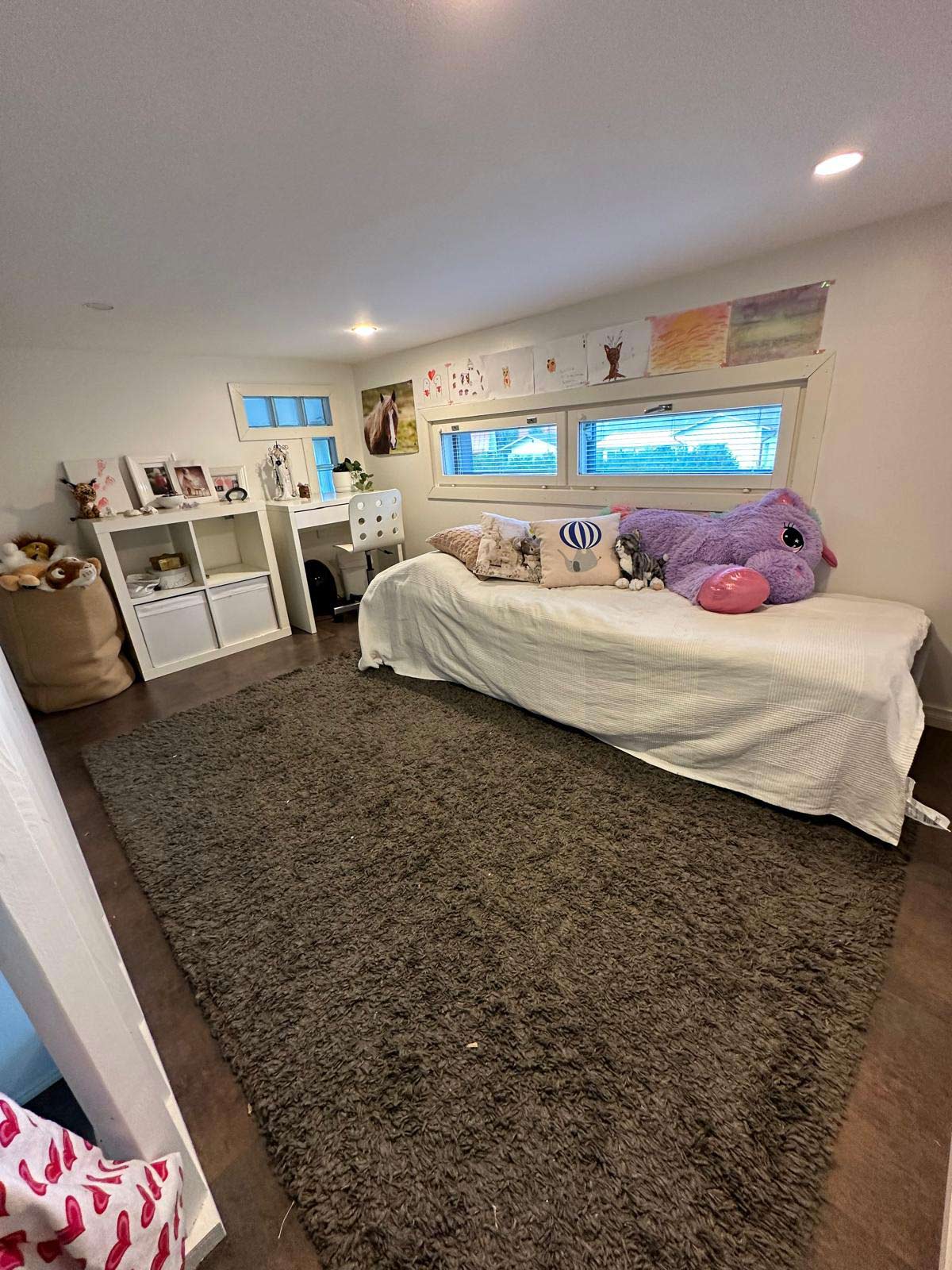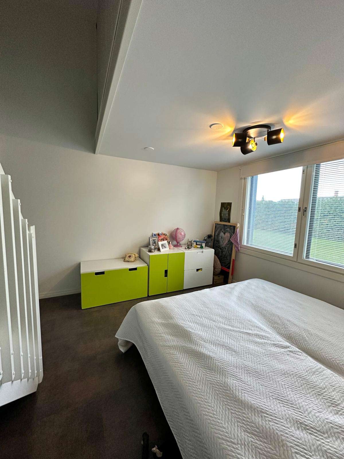 Lapsen makuuhuonetilassa järjestäisin tilan uudelleen. Sängyn sijoittaisin poikittain huoneen perälle pienten ikkunoiden edustalle, koulupöydän siirtäisin ikkunoiden alle ja vierelle oikealle puolelle valkoisen säilytyskalusteen. Ihanista taideteoksista valitsisin muutaman ja kehystäisin isojen ikkunoiden oikealle puolelle päällekkäin esim. kaksi.