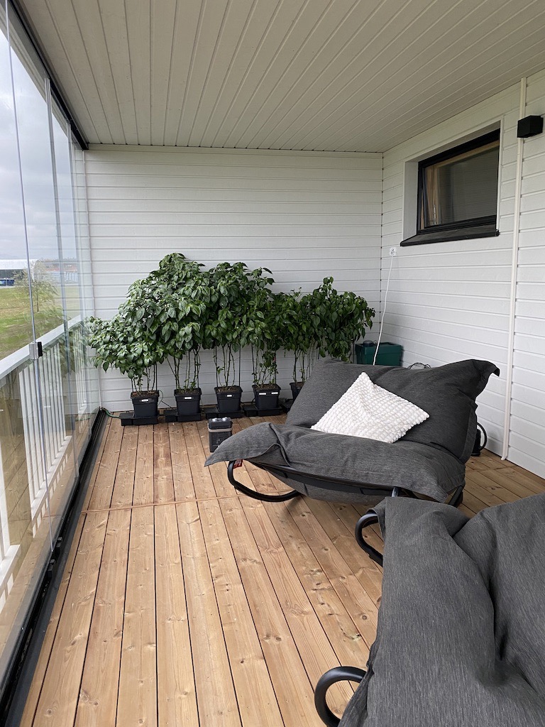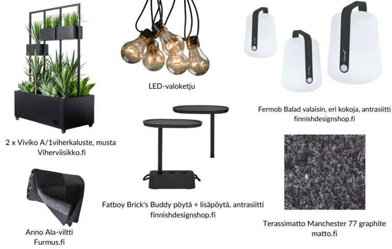 Terassille laittaisin kauttaaltaan helppohoitoisen matto.fi terassimaton sävyssä Manchester 77 graphite. Matto luo huonemaista tuntua tilaan. Viherkasveille hankkisin Viherviisikolta ViViKo viherkasvitelineen tai -telineitä. Niitä on monen kokoisia vaihtoehtoja.